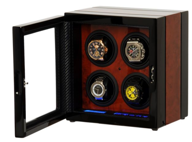 Display and wind your watches in a classy manner, since you are looking for a watch winder that wind's 4 automatic watches, you must be an enthusiastic fine watch lover and collector, rest assured that your fine watches will be wound and displayed properly in this high quality watch winder. We wanted to make this winder one of the best on the market at an affordable price, with our more than 10 years of experience in this field and our customers feed backs during this time we implemented all the options that we believed an automatic watch collector will want in a watch winder. Interior is lined with fine leatherette and comes with spongy egg shaped watch pillows to hold your watch firm in the turntable drum. Exterior is high gloss fine piano finish with an astonishing 6 coats of lacquer to give mirror like look. Door sensor if you enable this door sensor with a switch on the back of the unit, rotation will stop when you open the door and resume after closing the door. LED light switch, you can turn LED light option on or off with a switch on the back of the unit. Full operation remote control. This winder is programed to complete set numbers of TPDs in 12 hours, and turn itself to sleep mode for the next 12 hours, when 24 hour cycle is complete it will start over again. So you have the option to make this unit work during the day or at night. It has 5 different TPD (Turns Per Day) settings, 650, 750, 850, 1000 and 1950 TPD, and 3 rotation modes, clockwise, counter clockwise or bidirectional rotation. 650TPD: rotates 60 seconds every 10 minutes. 750TPD: Rotates 60 seconds every 9 minutes. 850TPD: Rotates 60 seconds every 8 minutes. 1000TPD: Rotates 60 seconds every 7 minutes. 1950TPD: Rotates 60 seconds every 3.5 minutes This particular Accuratic watch winder is designed to wind and display your fine automatic watches with several options that you cannot find on most watch winders on the market.